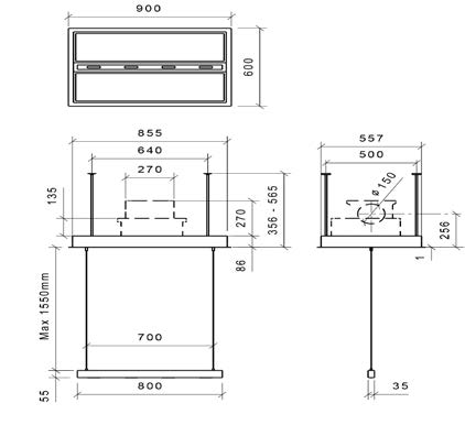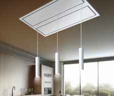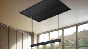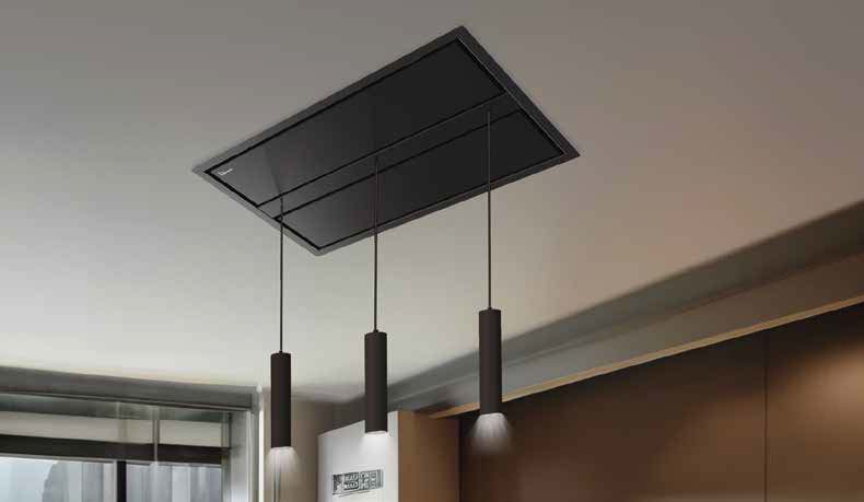 Una nuova cappa a soffitto, con la possibilità di agganciare sotto un elemento luminoso che può essere posizionato all’altezza desiderata. Disponibile nera o bianca, con alcune varianti nelle luci, ha l’aspirazione perimetrale e viene controllata tramite telecomando, app per smartphone o Alexa Il motore può essere installato fino a 6 metri di