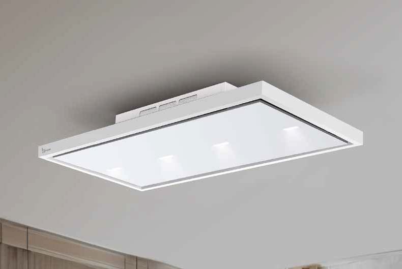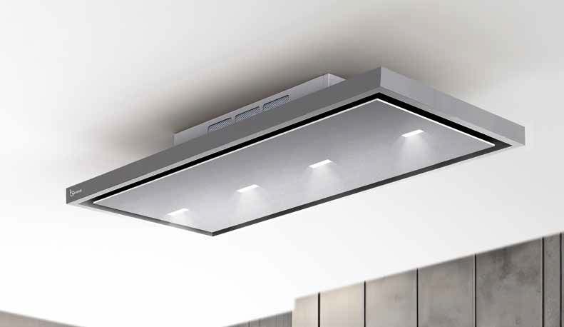Gea Free è un modello a soffitto che non ha bisogno di essere incassato ma rimane a vista ed è usato in versione filtrante. Finitura in bianco lucido, oppure inox satinato, con un motore piatto da 900 o 1300 m3/h, aspirazione perimetrale, faretti a LED, telecomando di serie e filtro antiodori hi-filter lavabile e rigenerabile.